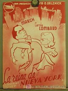 So she says Yes. And goes to NYC, where people pay top dollar to look at a brave, dying girl. She also falls for Frederic March in true screwball style (which means a love larded with profound irritation), at one point begging him, “Lemme hit ya just once–just once on the jaw!” The screenplay is profoundly, enliveningly cynical, but the whirling joyous center of it all is Lombard, eyes glassy with determination to enjoy every minute in New York City. Just as she’s beginning to believe her own press–though she tends to forget that all this high living is about her imminent death– someone finds out about her real test results.