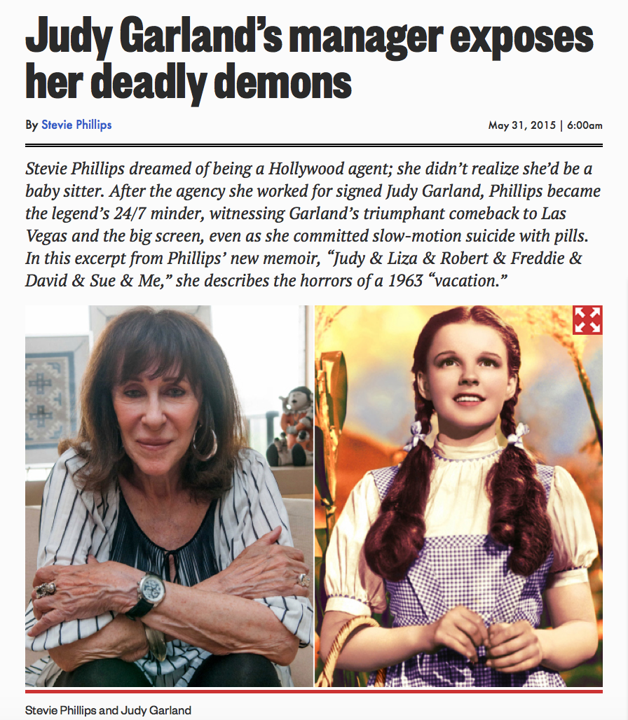 Stevie Phillips, who wrote the memoir, Judy & Liza & Robert & Freddie & David & Sue & Me, worked for Garland for four years. She deserves both a medal and a lobotomy for having done so. Or perhaps a double of each, since Philips then turned around and worked for Liza, too. She must be the Catholic Saint of Enablers.